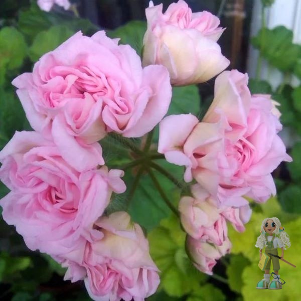Эта пеларгония всегда привлекает внимание своими изящными махровыми цветами, похожими на раскрывшиеся бутоны садовых роз. Благодаря розово-жемчужному оттенку лепестков и характерному блеску шапки выглядят очень нежно и благородно, кажутся воздушными, легкими. Крупные цветы собираются в мощные шапки, расположенные по всему кусту. Соцветия не осыпаются, а постепенно засыхают на цветоносах.