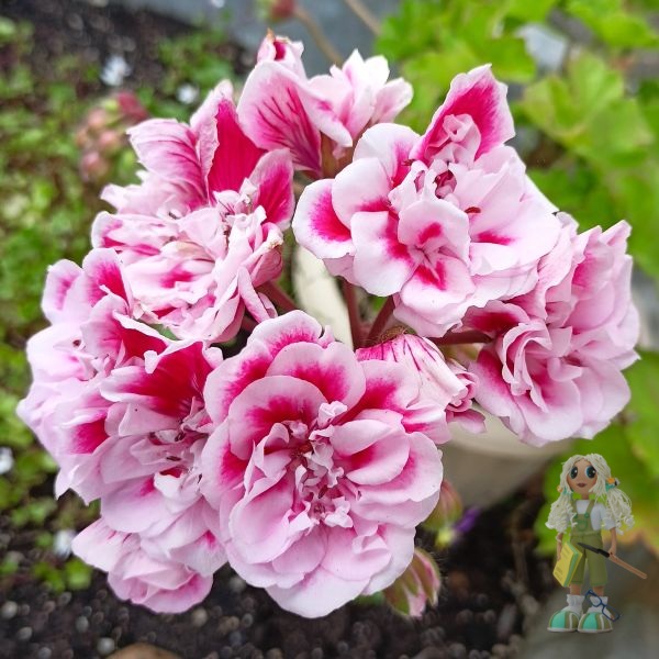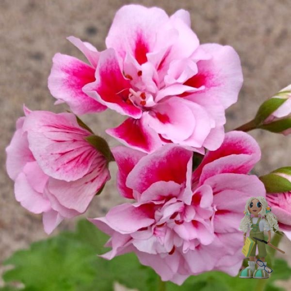 Цветки крупные, махровые, собраны в пышные соцветия, но главным достоинством является окраска: они розовые всех возможных оттенков, с каймой, пятнами, штрихами и точками, что выглядит очень эффектно и необычно.