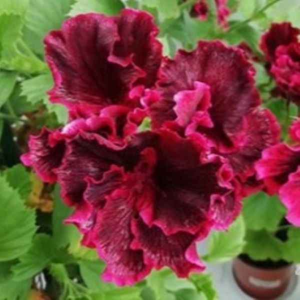 Rimfire – это потрясающий сорт королевской пеларгонии, который поражает красотой своих темных бархатистых соцветий, размер которых достигает 15 см. Края лепестков гофрированные, сами цветы простые. Их окраска темно-бордовая с сочетанием огненно-красного и почти черного оттенков, иногда проявляется белая окантовка. Насыщенность цвета также является одним из особых достоинств сорта.
