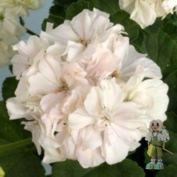 Пеларгония Brookside Champagne представляет собой пушистый миниатюрный кустик с огромными махровыми цветками нежной белой с розоватым налётом окраски. Растет медленно, цветёт очень обильно и продолжительно.