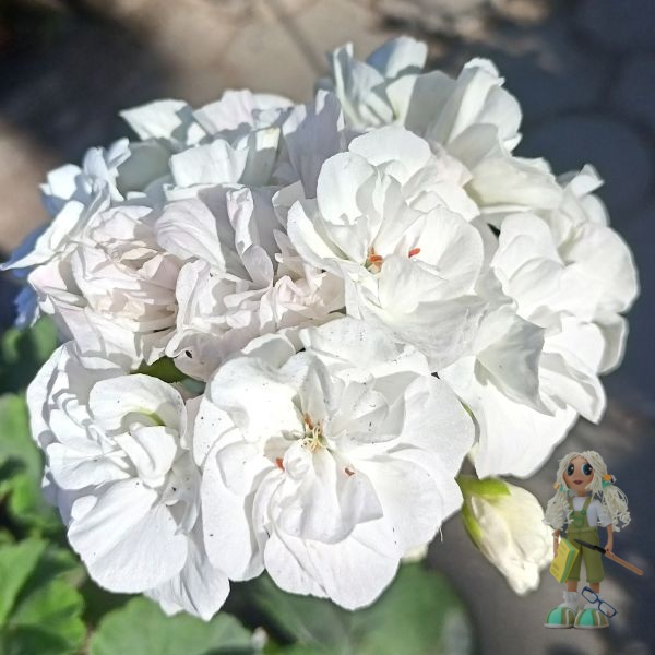 Gardenia — махровая зональная пеларгония с крупными снежно-белыми цветами. Шапки соцветий крупные и очень плотные, цветение обильное и продолжительное.