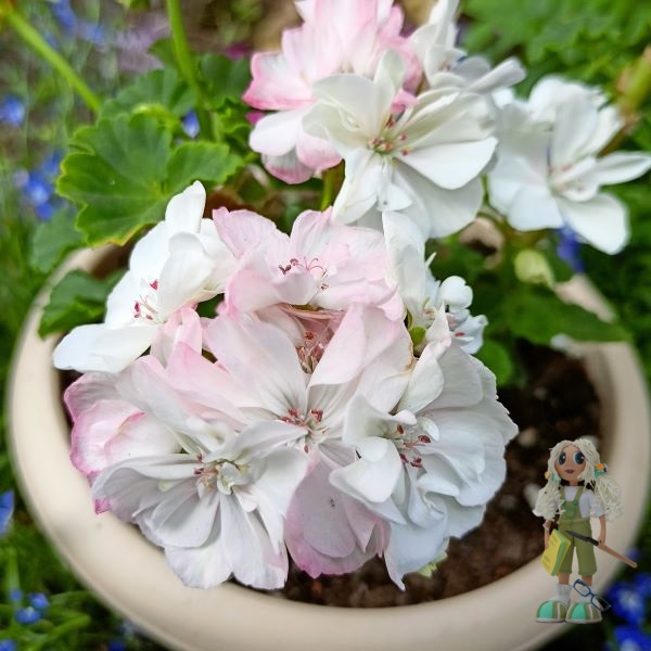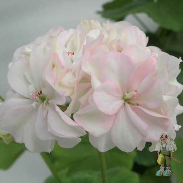 Pot Pourri — зональная карликовая пеларгония с полумахровыми крупными соцветиями белого цвета. В начале роспуска лепестки с зеленоватым оттенком, а на жаре их кончики розовеют. Листья сочного зеленого цвета.
