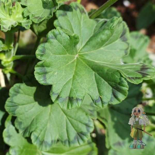 Волна Арамиль – зональная пеларгония с тёмной краевой зоной на зелёных листьях.
