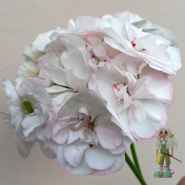 BY-Белые Росы — великолепная зональная пеларгония белорусской селекции с огромными шапковидными соцветиями, состоящими из нежнейших крупных махровых цветов бело-розового оттенка. Цветение обильное и продолжительное, с весны до поздней осени.
